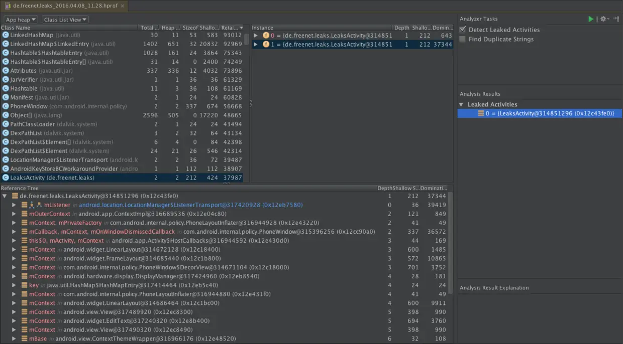 如果我们选中泄露的Activity,可以得到一个引用树,该引用树可以检测持有该Activity的引用。通过寻找深度为零的实例,我们发现位置管理器中的实例mListener,是我们的Activity不能被GC回收的原因。回到我们的代码,我们可以看到,这个引用是由于我们在requestLocationsUpdates方法中设置Activity作为位置更新回调导致的。通过阅读位置管理器文档,问题很快变得清晰,为了取消回调设置,我们简单地调用removeUpdates方法就行了。在我们的例子,因为我们注册更新是在onCreate方法,显然要注销的地方在onDestroy方法。