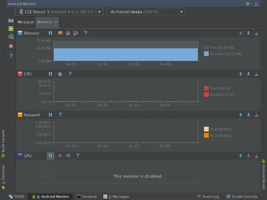 但为了解决内存泄漏,我们首先必须要能够找到它。幸运的是,Android Studio有一个叫做 Android Monitor的内置工具,我们可以用它来 观察除应用内存使用情况。我们需要做的仅仅是打开Android Monitor 并转到对应tab,看看使用了多少内存和内存实时分配情况。