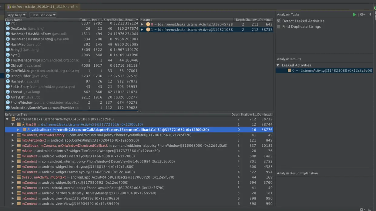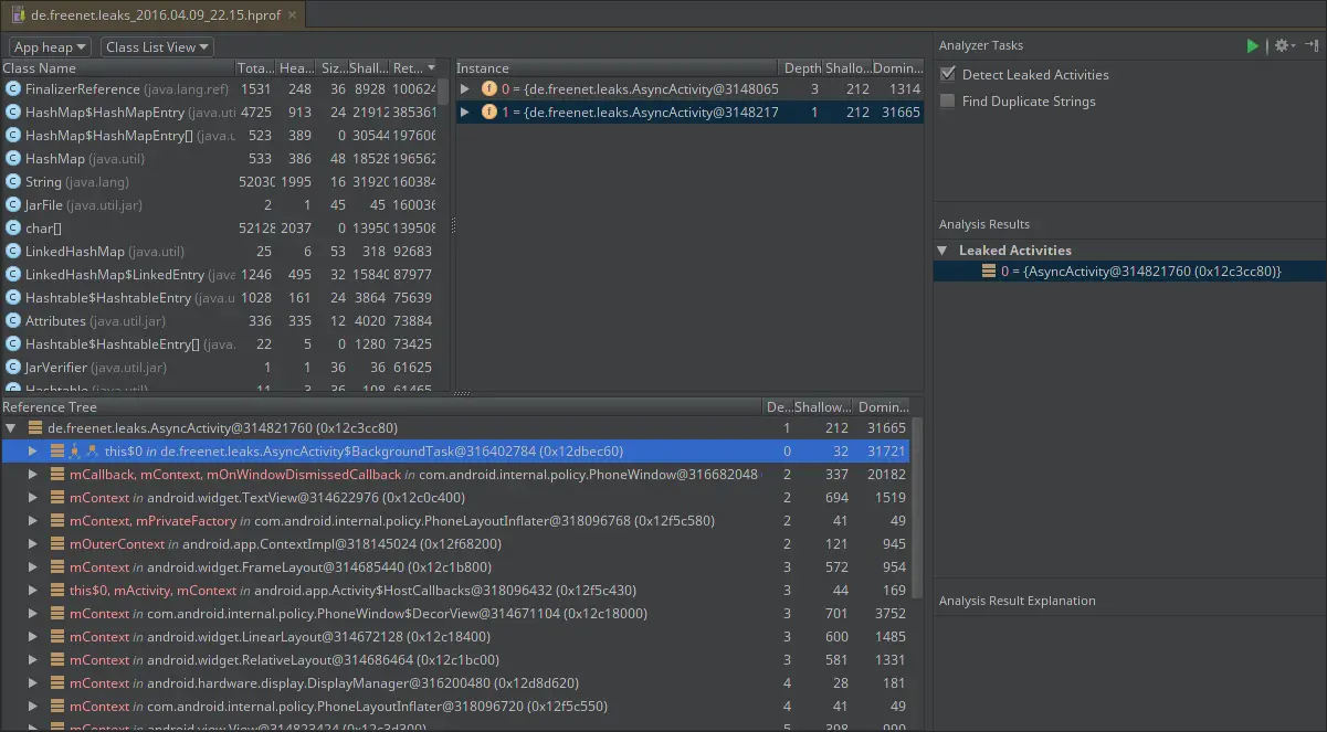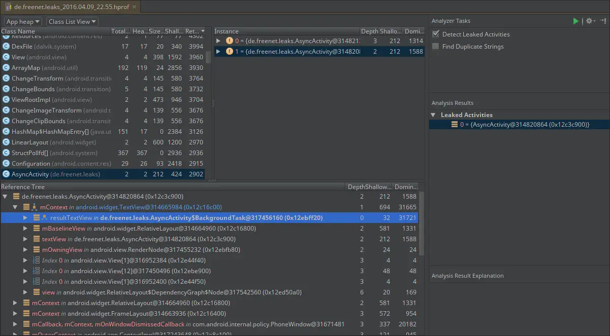 我不会去深入有关如何分析巨大的内存堆。相反,我会把你的注意力引导到 Analyzer Tasks(下面截图中的右上角)。为了检测上面的例子中引入的内存泄漏,你所需要做的检测是检查泄露的Activity(Detect Leaked Activities),点击播放按钮然后在Analysis Results下面就会显示泄露的Activity情况。