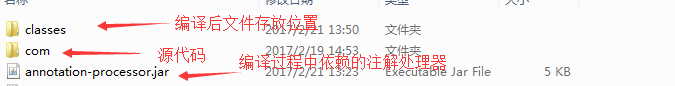 - 源文件位置:E:\EclipseWorkspace\Cnu\annotation-processor\src\main\java,编译后.class文件存放到classes文件夹下,使用javac命令编译源代码需要指定.java文件,为了避免在命令行中敲太多代码,所以将要编译的源代码文件都列在了sources.list文件中。