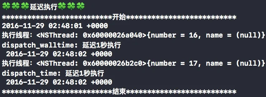 print("执行线程:\(getCurrentThread())\ndispatch_walltime: 延迟\(time)秒执行\n")