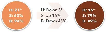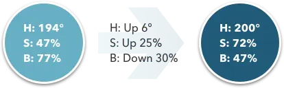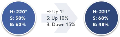 其中的诀窍就是:如果你想要一个更深的颜色变化,色相可以朝着红(0度)、绿120度)或者蓝(240度)方向移动(当然已经假定调低明度和增加饱和度了)。