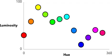 当然黄色要亮些。即使保持明度和饱和度不变,仅仅改变色相,你会得到一系列的亮度,或者说是感知的明度。
