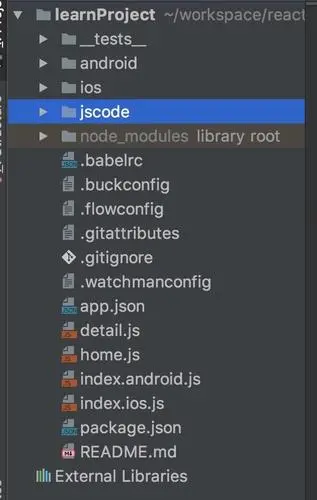 React Native创建工程,是通过在命令终端输入 react-native init 你的项目名字 来创建工程的,创建的工程会从网络端,同步到你终端所在路径的本地,生成一个和android project类似的项目,如下图。
