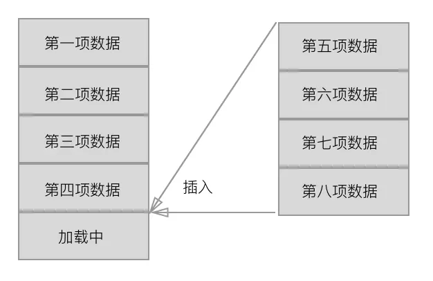 - 如果后台给我们的是四个数据,那说明有可能后面还会有数据,那我们这时候拿到四条数据后,只需要在最后一项前面插入,这样的话,最后一项的状态也不需要改变。