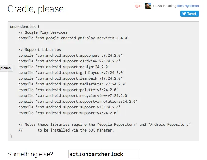 Gradle, Please Chris broadFoot做的一个非常酷的一个library,只需要输入一个Library 的名字,就可以得到这个Library 的gradle依赖code,并且是该Library的最新版本,不要错过这个网站: