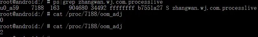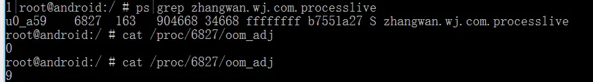 看到adj值是0,0就代表这个进程是属于前台进程,我们按下Back键,将应用至于后台,再次查看