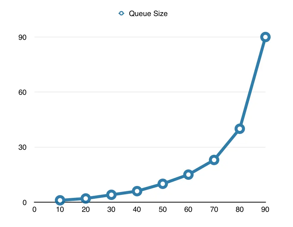 在零件制造车间中,每一个零件都需要按照既定工序通过车、镗、铣、磨、刨等车床,每一个阶段都需要占用车床资源进行特定的加工工作。和零件加工类似,来自客户的每一个功能性需求也同样要经过类似处理流程,从需求分析到编码开发,从构建打包到部署测试,每一个环节都需要占用一定的资源。如果在单位时间内,资源占用的比率越高,就会产生比较严重的排队现象。如下图所示,在单位时间内如果资源占用大于百分之七十,队列的长度也会呈指数型增长。