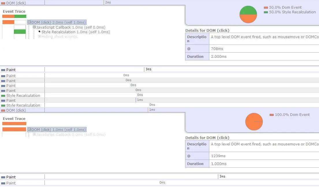 图上第一次点击执行2ms (其中有50% 用于style Recalculation), 第二次1ms,而且第一次click后面也跟了2次style Recalculation,而第二次点击却没有style Recalculation。