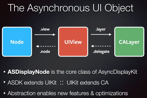 - 系统objects的创建与销毁。由于UIKit封装了CALayer以支持触摸等显示以外的操作,耗时也相应增加。而这些同样也需要在主线程上操作。ASDK基于Node的设计,突破了UIKit线程的限制。