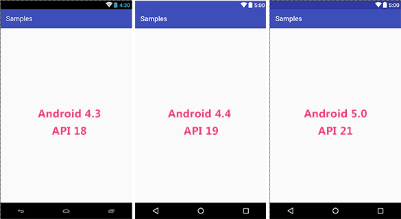 </resources>说明一点,使用这种处理方式后,5.0 系统中应用的状态栏背景色可随意定制,同时与使用 <item name="android:windowTranslucentStatus">true</item> 样式有所不同的是,该处理方式不会引起内容视图的向上延伸,所以不需要在 layout 布局文件中额外添加 android:fitsSystemWindows="true" 属性。当然,添加了也无所谓,毕竟还要兼容 4.4 到 5.0 之间的版本。
