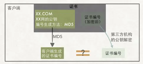 当客户端拿到证书后,开始对证书中的内容进行验证,如果客户端计算出来的证书编号与证书中的证书编号相同,则验证通过: