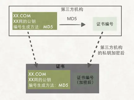 证书的制作如图所示。证书中的“编号生成方法MD5”就是告诉客户端:你使用MD5对证书的内容求值就可以得到一个证书编号。
