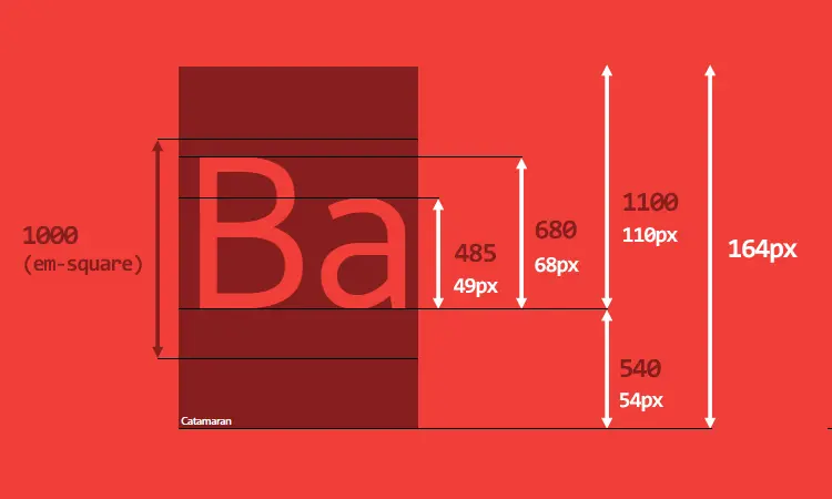 这意味着Catamaran字体在1000个单位的em-square使用了1100 + 540个单位,也就是说font-size:100px的时候,其高度是164px。这个计算高度定义了元素内容高度(在这篇文章中其它部分引用这个术语content-area)。你可能想到是内容区域相当于background属性。