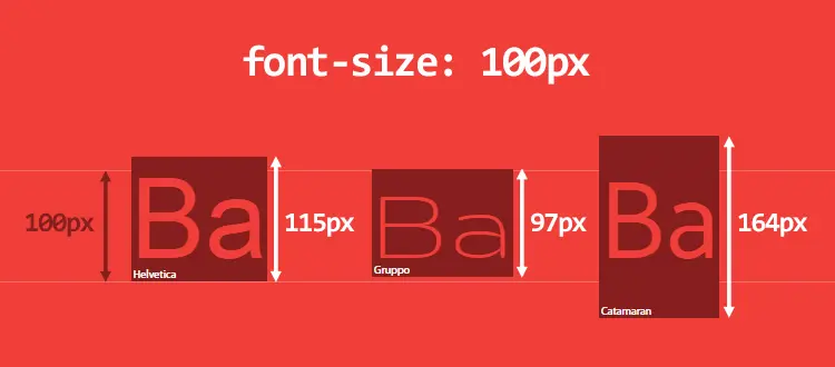 即使我们意识到这种行为,但还是不清楚为什么font-size:100px时元素的height不是100px?我测量发现:Helvetica字体的高度是115px,Gruppo字体的高度是97px和Catamaran字体的高度是164px。