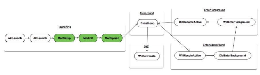 BHAppDelegate中除了回调系统的事件,还将App生命周期进行扩展,增加ModuleSetup,ModuleInit,ModuleSplash,此外开发人员还可以自行扩展。