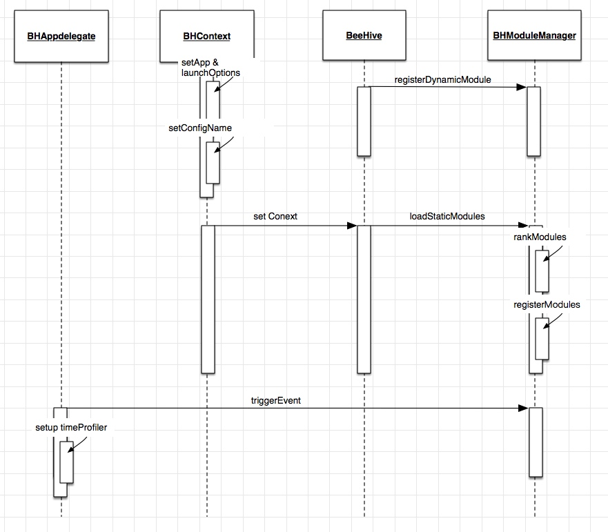 图中包含了主要的BeeHive启动过程以及Module的时序逻辑。Module的事件分发源于BHAppDelegate中的triggerEvent,对应GlobalContext也在回调中提供给业务方。