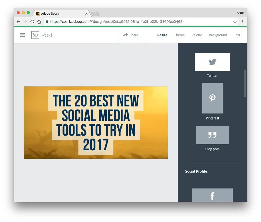 - 在创建图像的时候,你可以根据不同的社交媒体平台更改图像尺寸、改变颜色、背景和文本。