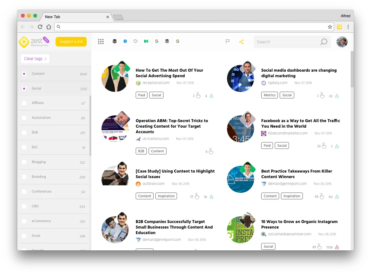 如何使用:你只需要添加这个Chrome 插件,以后每打开一个新的标签,Zest 就会为你提供最新的精准营销文章。