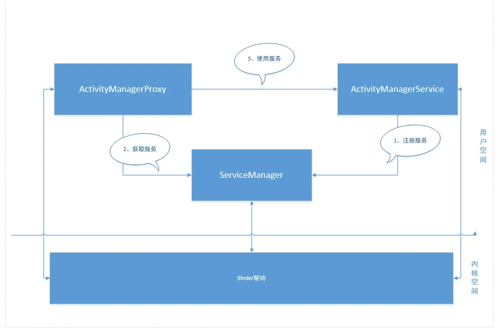 - 获取服务:Client进程使用AMS前,须先向ServiceManager中获取AMS的代理类AMP。该过程。AMP所在进程(应用进程)是客户端,ServiceManager是服务端。
