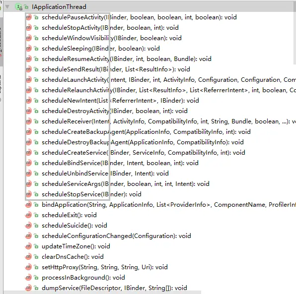 IApplicationThread接口定义的API,一看就比IActivityManager高逼格一点,IActivityManager好多方法是start开头,表示去AMS请求,IApplicationThread以schedule开头,表示对Activity进行调度。