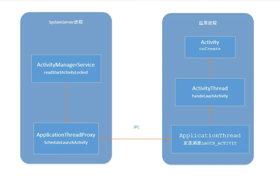 大致过程就是,SystemServer进程在收到请求后,再通过IPC向应用进程发送scheduleLaunchActivity请求,应用进程的binder线程(ApplicationThread)在收到请求后,通过handler向主线程发送LAUNCH_ACTIVITY消息,主线程在收到Message后,创建目标Activity,并回调Activity.onCreate()等方法。
