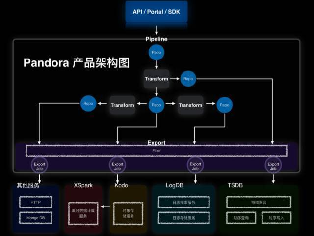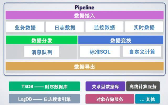 什么是数据总线?企业内部的数据都经过数据总线,数据总线的数据想流动到哪里都可以。数据接入,数据来源可以多样化,可以来自业务,可以来自日志数据、监控数据、实时数据等。这些数据进来以后,最后会通过数据的变换,Pipeline 可以认为是一个实时计算,它可以定义一些数据的变换,再去把一个 Pipeline 或者多个 Pipeline 里面的东西去聚合。最后,这些数据导出到 TSDB、LogDB、Kodo、MySQL/MongoDB 等。分析引擎在我们看来是非常多样化的,会跟你的需求密切相关。我们认为,你要抽象一个大数据的产品,最重要的是要抽象出数据总线。