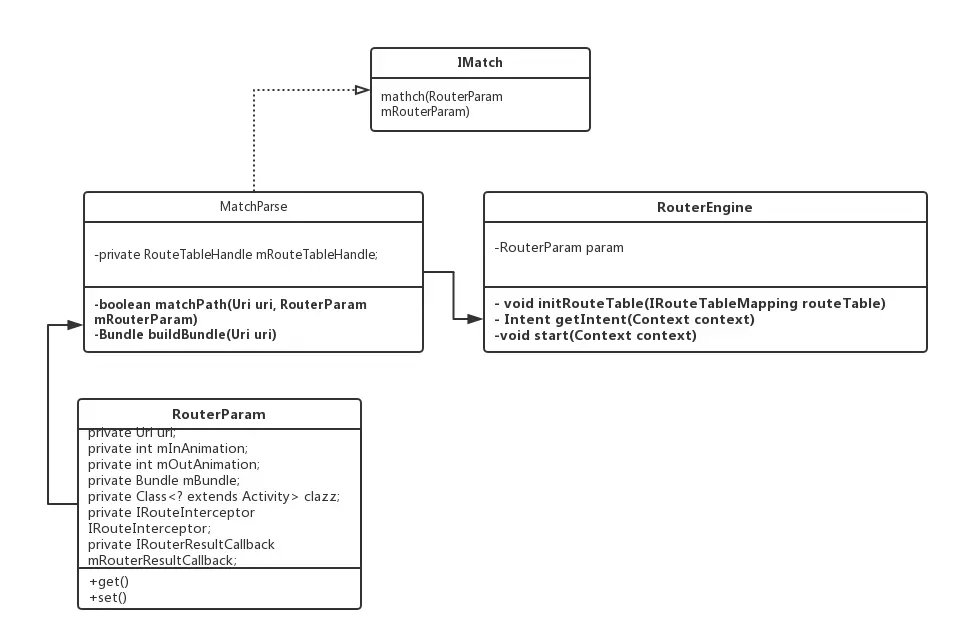 首先编写的是MatchParse类,最里面的一层核心层,就是我上面所说的解析和组装,这些我们认为是固定的不轻易改变的,这一层原则上调用者不需要知道具体怎么去做。RouterSDK 将解析uri、拆解参数、组装bundle,最终根据解析的结果以code形式返回上一层。然后在RouterEngine类处理业务相关的,如路由表的增删改查、interceptor的编写、跳转动画的实现等等。这一层可以根据自己需求增强SDK。这样维护和扩展起来就非常的清晰了。最后编写的是API,提供相应的API调用。三方的AP都是通过这层调用SDK的方法和规范入口。