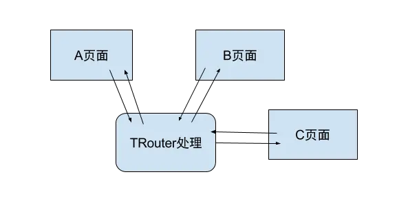 但是这样的通信方式太过直接,导致两个页面交集在一起,这时候想在他们之间做些事情是很难的,并且这样的方式其实不利于解耦。假设每个页面都是独立的个体,他们之间的通信通过一个中转器来处理,然后根据这个中转器来启动另外一个页面。这样我们就可以通过控制中转器按照我们的规则跳转。由于这个中转器类似于路由器功能,所以把它叫做Router。