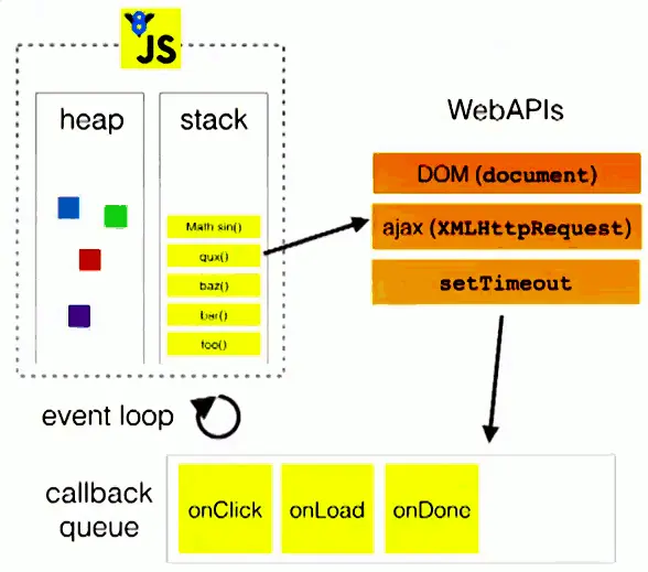 上图中,主线程运行的时候,产生堆(heap)和栈(stack),栈中的代码调用各种webAPIs,它们在任务队列中加入各种事件(click,load,keyup等)。只要栈中的代码执行完毕,主线程就会去读取任务队列,依次执行那些事件所对应的回调函数。