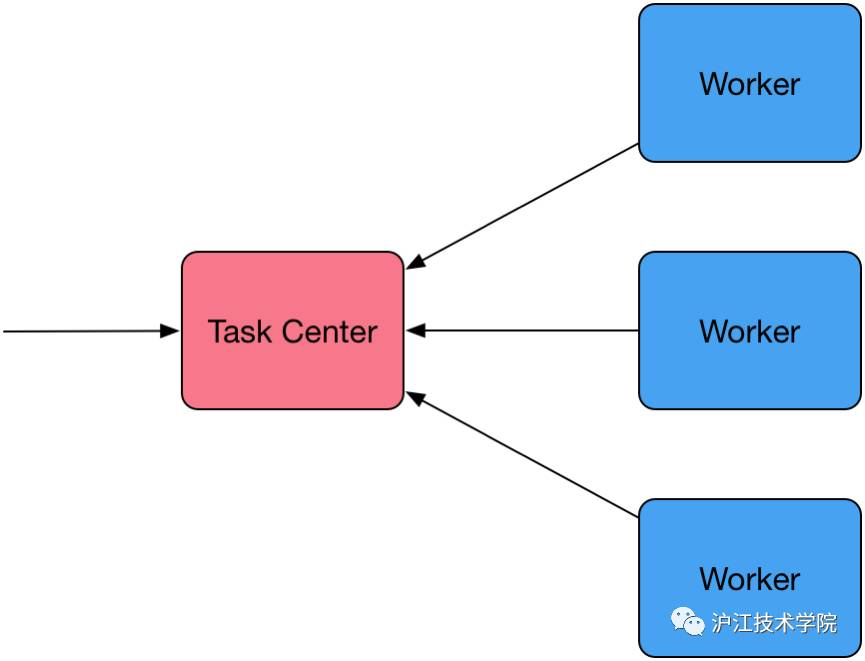 第一代任务系统出现在2010年。那时候任务数量还比较少,所以结构也简单。它由一个 Task Center和若干个Woker组成,架构如下图: