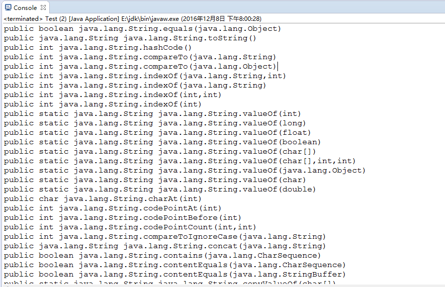 上面的代码简单地获取了String类的所有方法和属性,运行的截图如下: