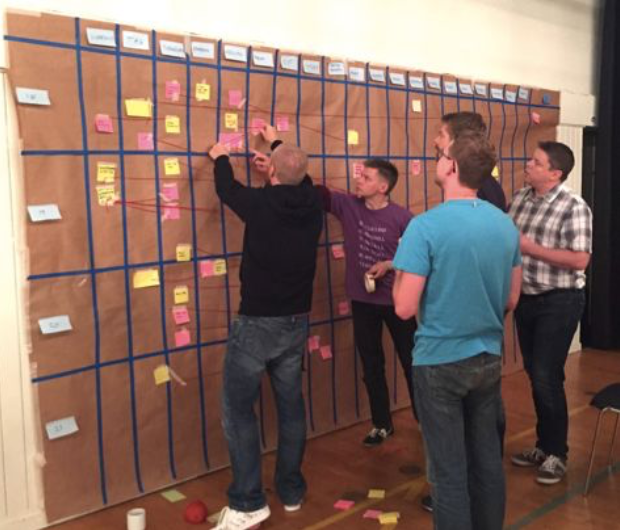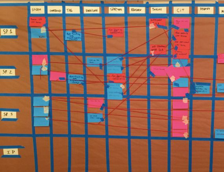 每一列是一个团队,每一行是一个迭代(2周)。便利贴代表了依赖关系,从蓝色到粉色。“为了交付这些(蓝色贴纸),我们需要你们提供那些(粉色贴纸)”你会注意到会有很多讨论,都是关于什么东西在哪个迭代、会被交付到谁那里。
