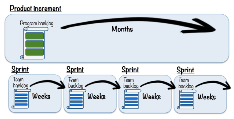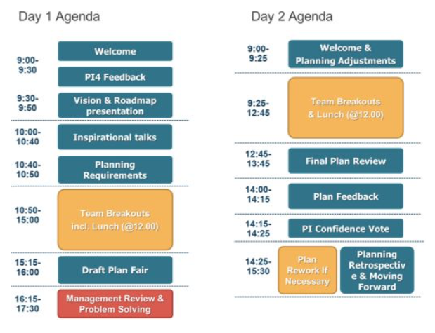 伴随着迭代,每个团队都有一个2周的计划范围。PI计划增加了一个更高层次的规划范围,在这里团队聚集在一起展望未来(2个月,一个“产品增量”),但不关注细节。