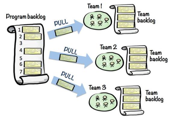 有些团队相当独立,他们拥有自己的待办事项列表。但是其他团队,例如平台组则需要和其他人一起工作,然后从共享的项目群待办事项列(Program Backlog)中拉取一些要做的功能。