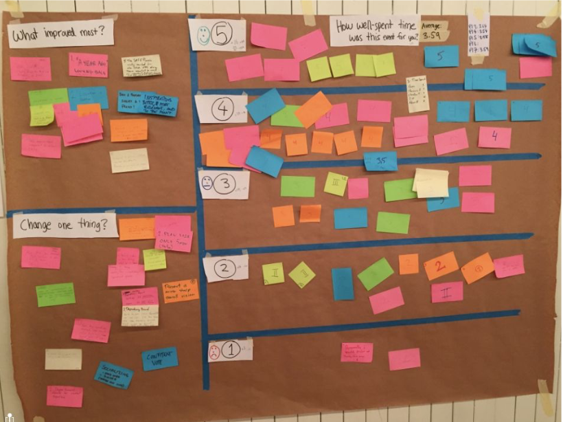 每个人都完成陈述后,他们后退一步并观察看板,找出模式和主题。大部分人都喜欢这个活动(大部分都是4或5的评分),认为时间花的值得。
