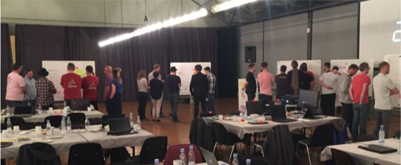 到下午早些时候,计划已经稳定了(或者已经到达他们的要求了),是时间进行最后的计划评审了。我们仍然采用相同的4场会话形式,团队继续可以到处游走和聆听彼此的计划。彩色乐高块被用于指示从昨天开始计划是否发生了大量变化,这就像是状态标识,可以帮助人们决定去听哪些团队的计划。