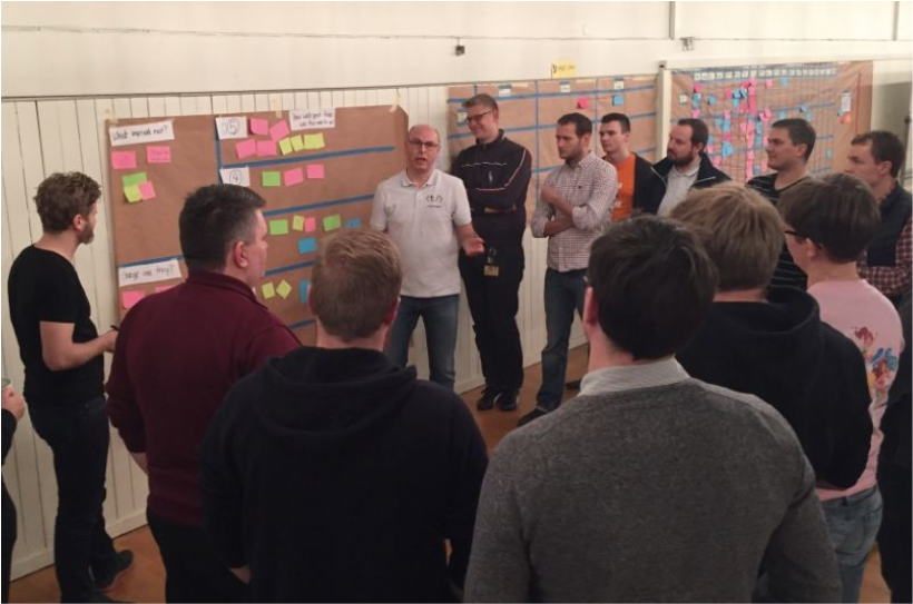 之后,除了ScrumMaster和引导者,其他人都回家。ScrumMaster和引导者们在改进看板前围成半圈,一个接一个,张贴来自他们团队的个人评分,总结反馈意见和改进建议。