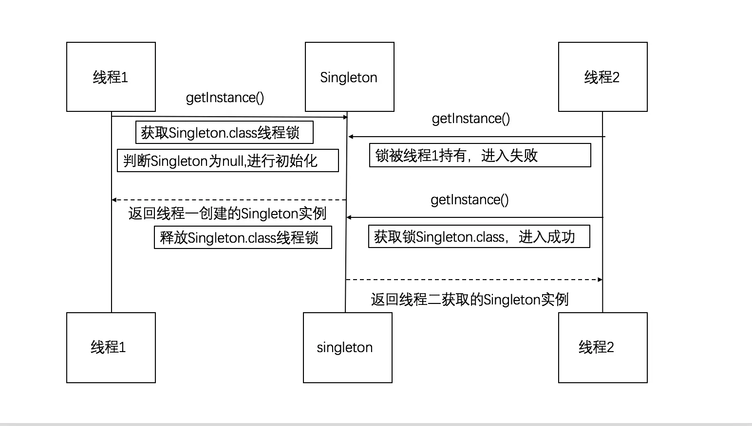 在线程一执行完getInstance()的逻辑后,释放Singleton.class线程锁,其他线程才能够进入其中,这样避免了创建连个Singleton的实例。