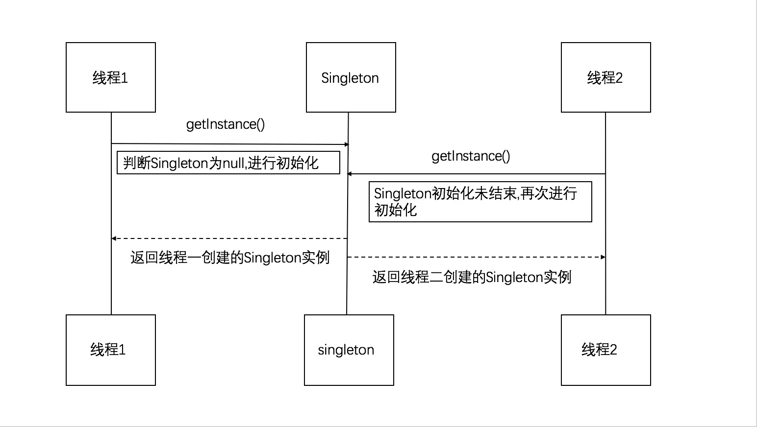 如果按照1-3-2的顺序执行,当执行了3的时候,instance已经不是空了,若此时线程2进入执行getInstance()方法后,判断instance不为空以后直接返回了Singleton的实例。