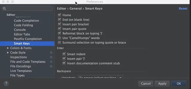 在"Editor->General->Smart Keys"中启动"CamelHumps"功能选项,就可以在连在一起的几个大写为首的单词间快速切换。Mac上是option+左右键。win上为 "alt" or "ctrl" 键。(这里会有个bug,开启后,比如你的变量名是几个单词,比如是isSuccess,这时候你双击想选中这个变量就发现不能全部选中,就变成选中Success了。)