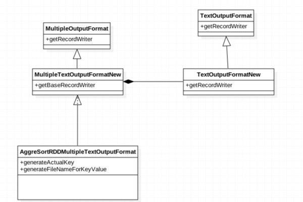 上面的类图可以清楚的显示类图的关系, MultipleOutputFormat 的writer 会调用子类的 getBaseRecordWriter, 我们可以在这里改写一下, 使用我们自己的 TextOutputFormatNew 的 getRecordWriterNew 方法, 在方法里面构造输出流的时候, 如果文件已经存在,就进行 append 操作,