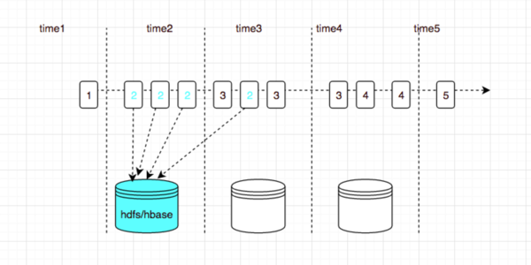 但是对于第二个问题,就很麻烦, 图中举例, 时间区间中 2 出现在了 time2 和time3, 我们需要在两个batch中计算出2 的指标, 然后进行累计, 这个累计的过程, 你可以在内存中保存状态, 使用 spark streaming 中的 UpdateStateByKey等算子, 但是不推荐这样使用, 这样就在你的应用中引入了状态和 checkpoint机制, 还有一个方法, 就是把这个状态放在持久化存储中, 比如每次都在 redis, 或者 hbase