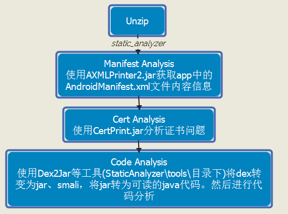 静态分析的处理流程集功代码在目录StaticAnalyzer\views\android下static_analyzer.py程序文件中。分析代码流程可知,在MobSF框架中静态分析主要包含三个部分,分别是Manifest Analysis、Cert Analysis、Code Analysis。流程如下: