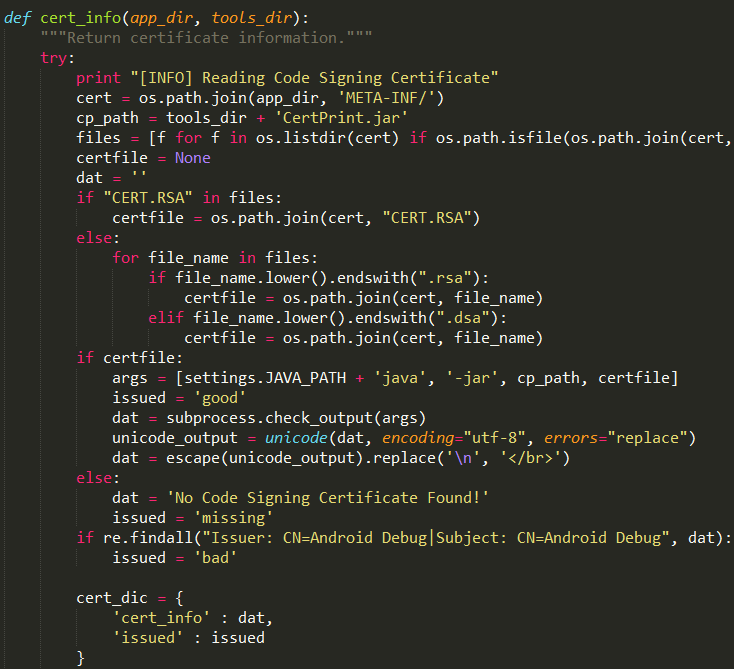 MobSF证书分析功能函数在cert_analysis.py文件中,MobSF首先尝试获取Hardcoded Certificates/Keystores,然后通过CertPrint.jar工具解析apk中证书的信息,并完成证书相关问题的分析。