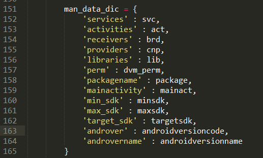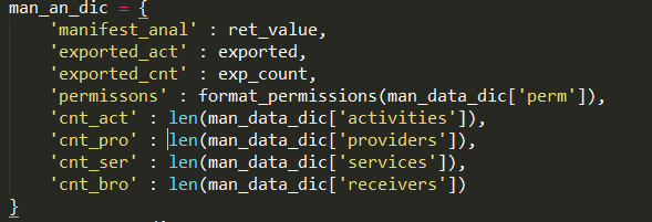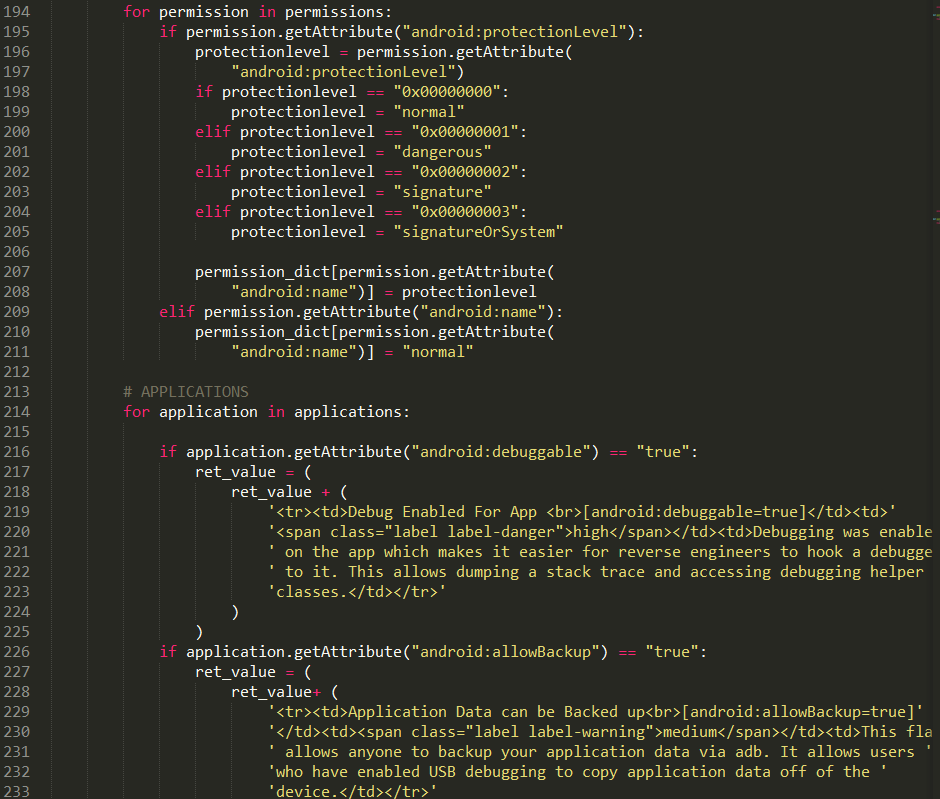 ManifestAnalysis主要功能是对AndroidManifest.xml进行解析,提取其中permission、granturipermissions、application、activties、services、intents、actions等,分析所有权限并对权限进行分级,包含正常、危险、签名、系统四个类别。对各属性配置进行检查,看是否存在不安全的配置,如allowBackup、debuggable、exported等属性设置。详细代码功能可见manifest_analysis.py程序文件。