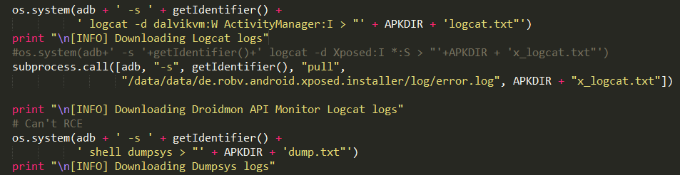 而动态分析部分,MobSF主要利用到了Xposed框架、Droidmon实现对应用程序调用API的情况进行监控,并且详细列出了需要分析的API列表。同时,MobSF还使用了ScreenCast结合adb shell input 完成对手机的远程控制功能。动态分析主要操作有: