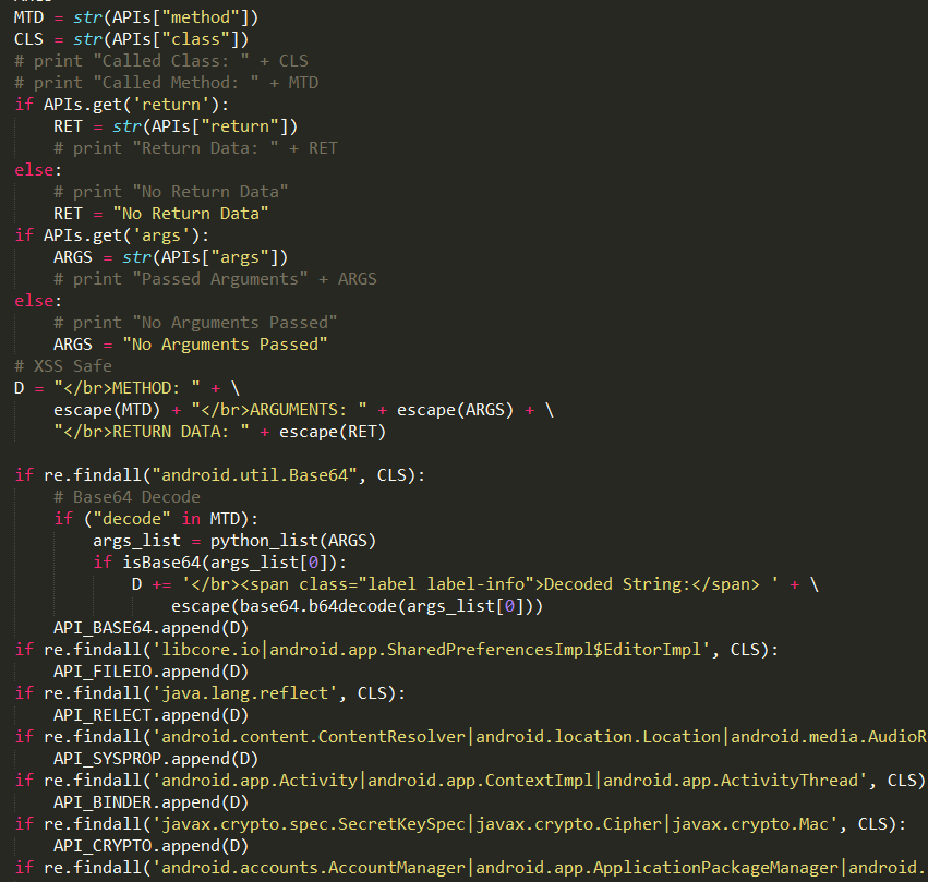 MobSF对日志的分析功能主要在APIAnalysis和RunAnalysis两个函数中,和静态日志分析一样,动态日志分析也是以正则匹配为主,APIAnalysis主要对x_logcat.txt中Droidmon.apk产生的日志进行处理,主要进行API调用分析,包括API的class、参数、返回值等,对需要监控的api函数在DynamicAnalyzer\tools\onDevice目录下的hooks.json文件中。包含监控函数详细的类名、方法名称等。