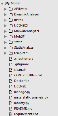 MobSF源代码结构主要包含静态分析、动态分析、API Fuzzer三个部分,本文不关注Django框架本身及Web处理相关的内容。如图: