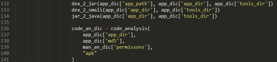 MobSF静态代码分析功能函数在code_analysis.py文件中,反编译的代码在converter.py中。其中使用Dex2Jar将dex转变为jar文件,使用Dex2Smali将dex转变为smali代码,使用jd-core.jar、cfr_0_115.jar、procyon-decompiler-0.5.30.jar将jar包转为为可读的java代码。